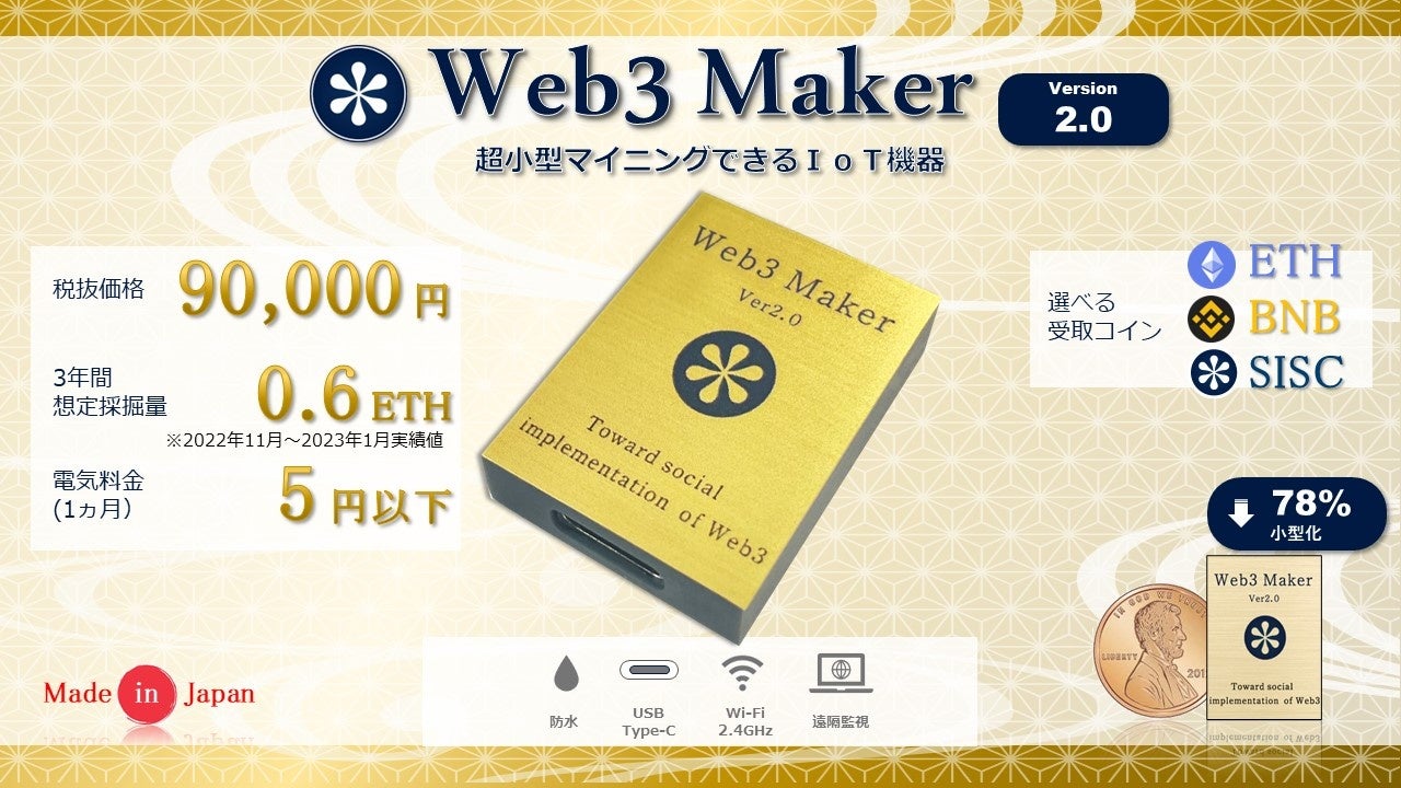 「Web3 Maker®」シリーズの正統な後継機である新製品「Web3 Maker® 2.0」は、旧型のDNAをそのままに、さらに78%もの小型に成功。圧倒的な省スペース化が実現したことで、設置場所を問わず、各種製品への搭載が可能となりました。今後、当社では「稼げる家電シリーズ」、各種IoT機器の制御基板として、「Web3 Maker® 2.0」を活用して参ります。また、システム面での改良も加えられ、遠隔でのWi-Fi設定や保守も容易となりました。