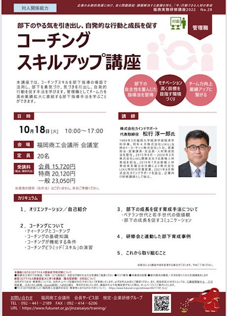 皆さんこんにちは。株式会社カインドサポート(福岡県福岡市中央区天神4-7-11クレアビル4階)代表取締役兼研修講師・コーチングコーチの松行淳一郎です。2021年3月に32年勤務した株式会社LIXILを退社し同年8月株式会社カインドサポートを設立しました。管理職と営業職の方のビジネススキルアップを行うことで営業チーム力を強化し業績拡大に繋げる仕事をしています。弊社は今年初めて福岡商工会議所実務研修講座の公募に応募したところ見事採用頂けることとなり、2022年10月18日火曜日「部下のやる気を引き出し自発的行動と成長を促すコーチングスキルアップ研修」の講師として登壇して参りました。本日はその時の模様を中心にお伝えします。
