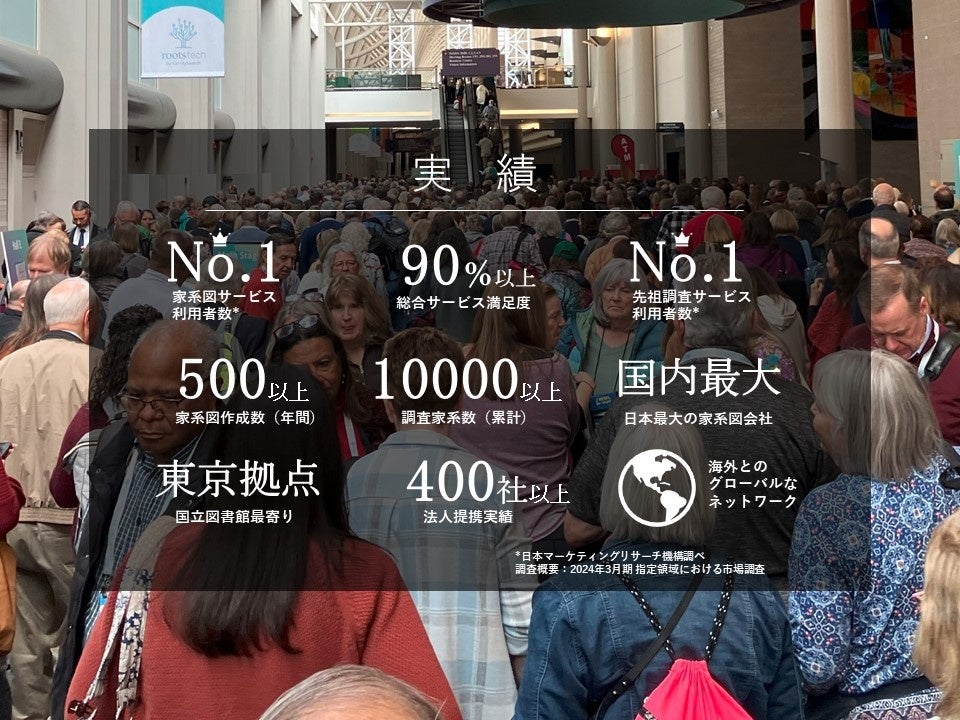 自社開発システムを用いた高品質な家系図作成の他、家系図作りに関する出張セミナー・情報発信・メディアの運営を行っています。 一般的な戸籍資料から作る家系図だけではなく、組織力・多くの専門家との連携を活かした歴史的な文献調査や現地調査まで手がけ、江戸時代やそのさらに昔のご先祖探しまでお手伝いしています。家系図・先祖調査のことなら全て対応できる、総合的な「ご先祖探しカンパニー」です。