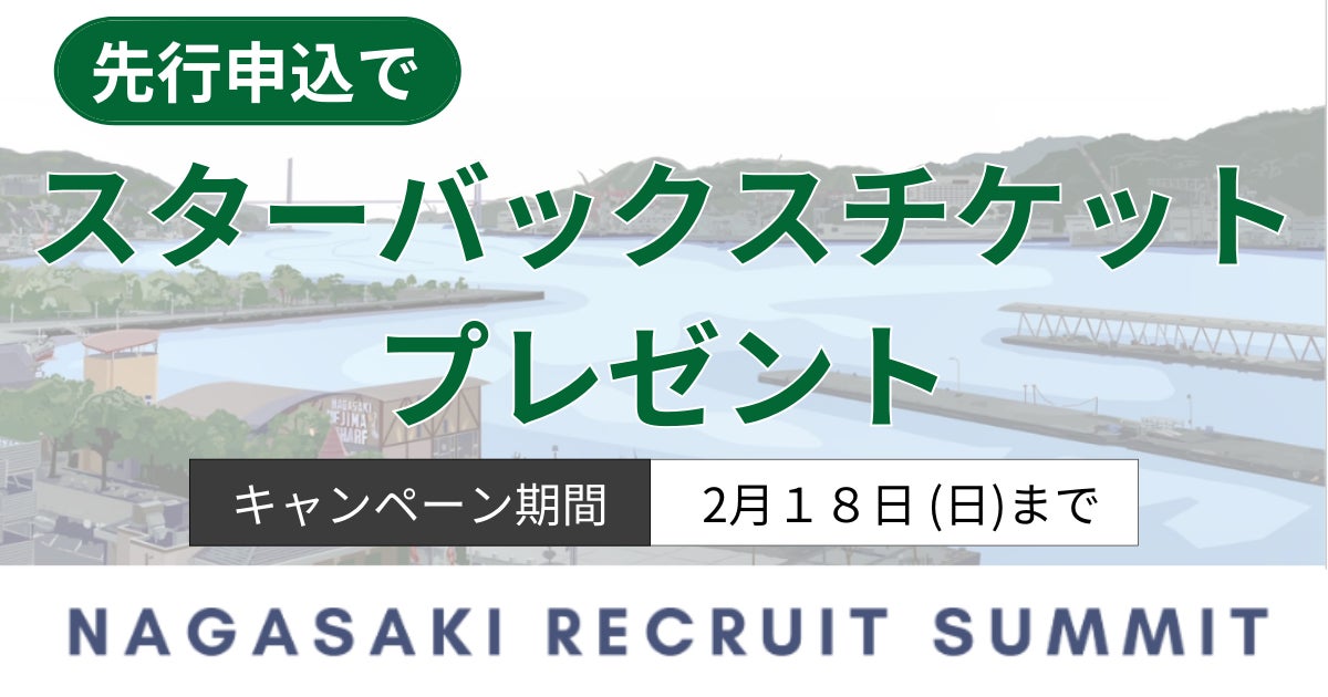 『NAGASAKI RECRUIT SUMMIT』の来場者特典である、Amazonギフトカード1,000円分に追加して、2月18日(日)中までにお申し込みされた皆様には、「スターバックスギフトカード2,000円分」を当日会場にてお渡しいたします。
