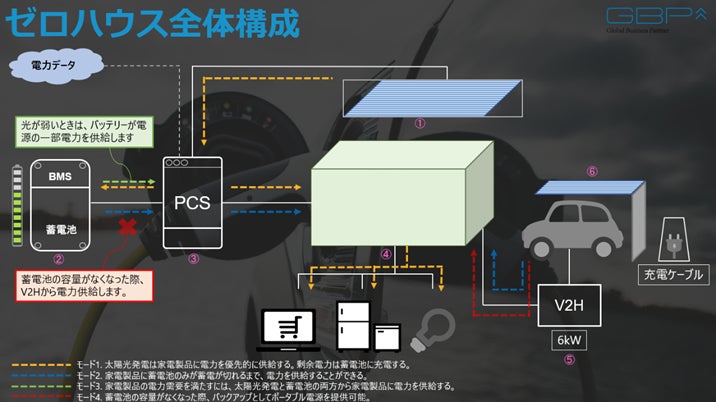 最先端エネルギー部品、ソリューションを提供しているGBP株式会社(本社:東京、以下GBP)は、太陽光発電、風力などの再生可能エネルギー導入により、コンテナハウスや避難所の独立電源を維持しながら、EV自動車にも充電可能な「ゼロエネルギーハウスソリューション」の提供を開始しました。非常時でも再生可能エネルギーによって継続的に発電し、家電製品やスマートフォンなどの充電ができます。省エネルギーを実現した上で、年間の一次エネルギー消費量ゼロを目指します。また、GBPのブランド、ハイブリッドパワーコンディショナー、蓄電池、普通充電器およびCHAdeMO(チャデモ)充電器、V2Hを一括提供することも可能です。