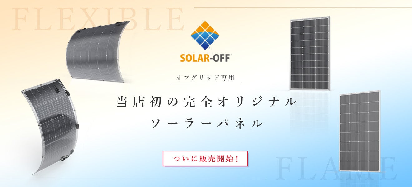 このたびソーラーオフ初となる完全オリジナル製品の発売となりましたが、近年の「オフグリッド」需要の高まりに応じて、電力の自給自足に最適なモデルを用途別に開発いたしました。手に取っていただきやすい価格と満足のいくスペックで、太陽光パネル(ソーラーパネル)の導入が初という方にもおすすめです。