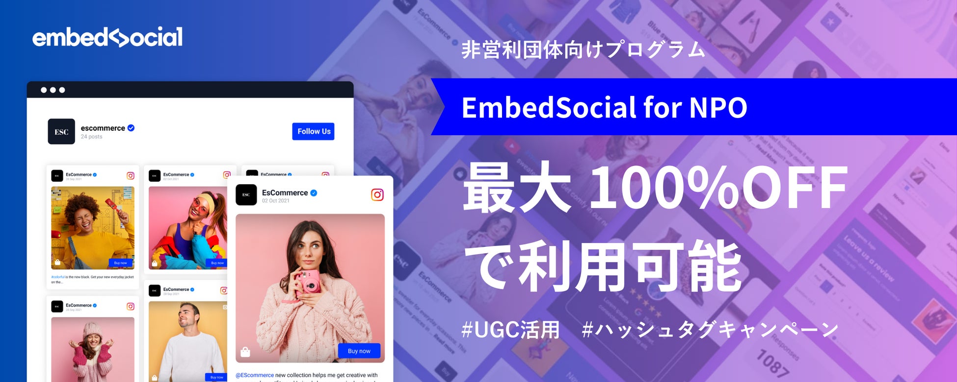 Embedsocial Japan株式会社では、非営利団体向けに最大100%OFFでご利用いただけるプログラムを開始します。非営利団体の宣伝活動を支援し、必要とする人に支援が行き届く社会を目指します。