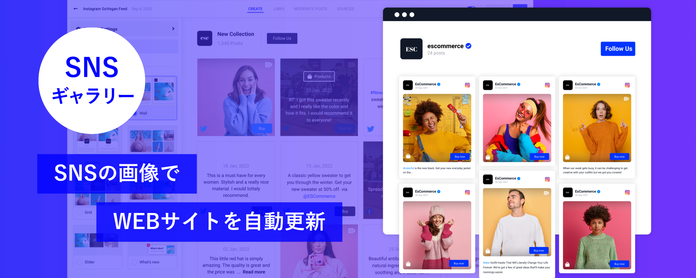 InstagramやTwitter・YouTubeなど7種類以上のSNSから投稿を収集し、自社サイト上に埋め込んで活用できます。ソーシャルメディアに投稿するだけでWEBサイトの情報も自動で更新することができるため、マーケティングにリソースを割くのが難しい場合にサイト運用コストを削減できます。