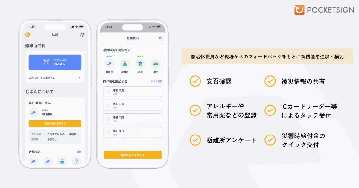 マイナンバーカードを活用するスマホアプリ『ポケットサイン』は、発災時のみならず平時でもご利用いただけるサービスです。災害時には、マイナンバーカードを用いたデジタル身分証アプリであることを活かして、避難先通知・個人別状況把握・名簿管理などを一本化できることが特徴です。