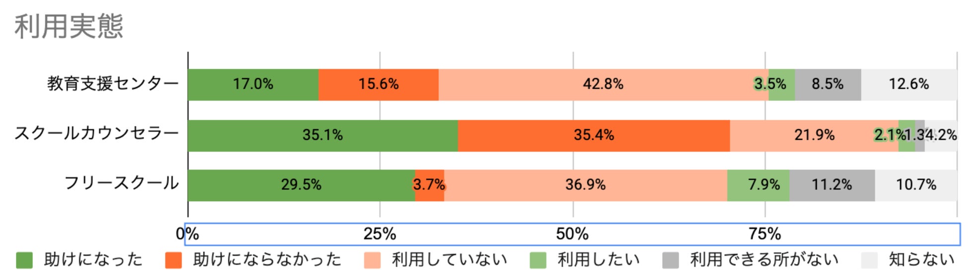 令和5年10月17日に文部科学省より発表された「児童生徒の問題行動・不登校等生徒指導上の諸課題に関する調査」によると、令和4年度の国立、公立、私立の小・中学校の不登校児童生徒数が約29万9千件(過去最多)、38.2%の子ども達が相談や支援に繋がっていません。私たちが2800人以上の不登校当事者からとった調査によると、教育支援センターなど公的な居場所の利用率や満足度は低い傾向があります(グラフ1)。その背景には支援者の当事者理解や支援スキルが充分でない施設や地域があることが、同調査より伺えます。また民間のフリースクール等も全国700箇所ほどと少ない状況です。その背景には公的支援が少ないことなどの要因があり、スタッフ研修が行いづらく組織基盤が安定しづらい背景にもなっています。