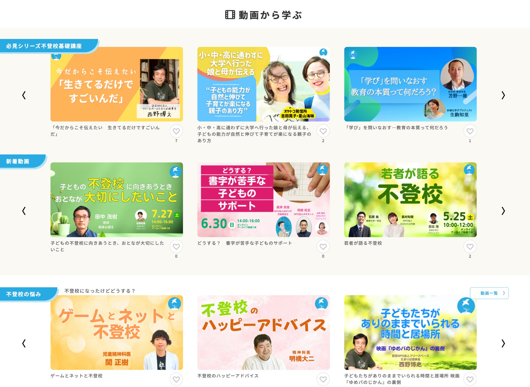 必見シリーズ不登校基礎講座/不登校の悩み/経験談(親)/進路・進学・就職/HSC・発達凸凹・LGBTQ/日本や世界の多様な学び/小さな居場所の作り方/支援スキルアップ/団体運営のヒント/団体の経営・資金