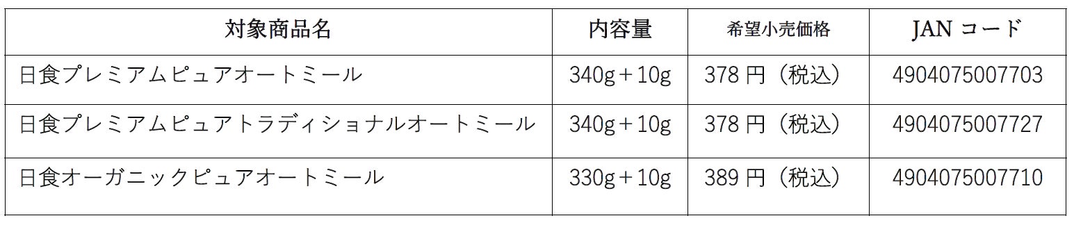 【キャンペーン内容】⽇⾷オートミール製品(下記3商品)の10g増量