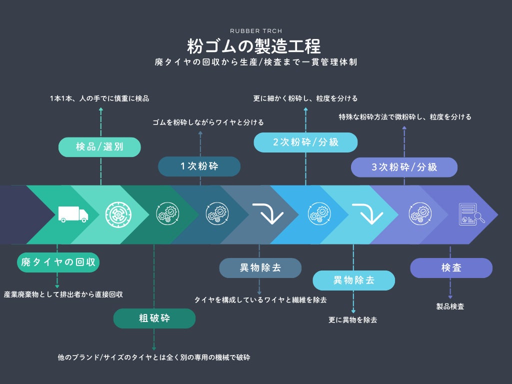 原料となる廃タイヤの回収から検品/選別、粉砕加工/異物除去/梱包まで自社による一貫管理をしています。私たちは自社で検品をしたタイヤ以外は原料として使用していません。破砕をしたチップ状での納入管理でタイヤのメーカーやサイズの管理ができますでしょうか?リサイクル材料は原料の原形からの管理が最も重要であると考えます。