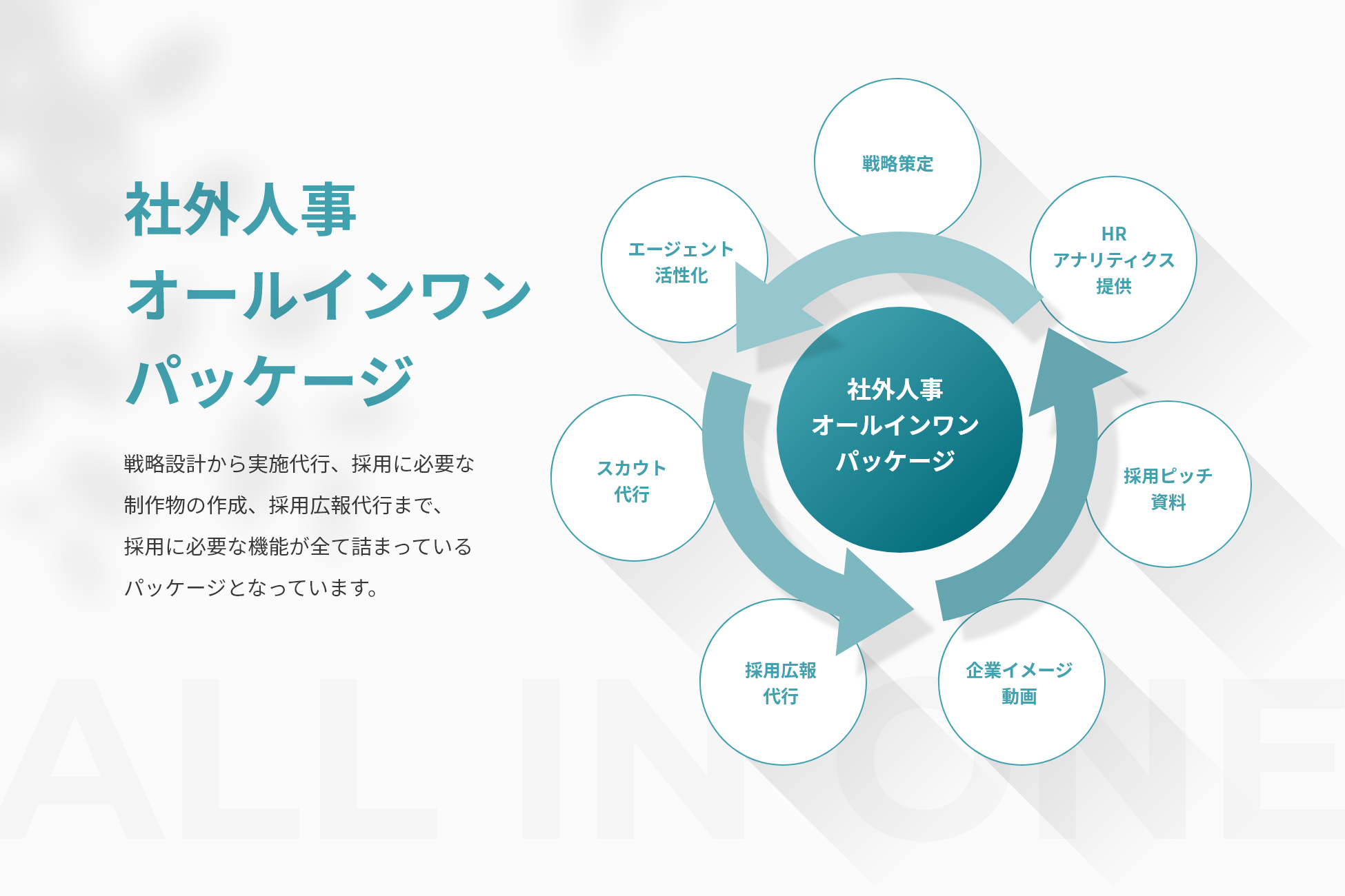 その実装を短期で実現するには、採用責任者の採用活動を進めながら、それまでの期間は以下のようなオールインワンパッケージを一定期間導入する必要があります。