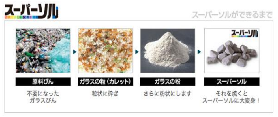 「スーパーソル」は、原料となるビン・ガラスを粒状に破砕した後、粉末状になるまでさらに破砕します。粒度分別装置によって均一なガラスの粉を取り出し、それぞれ発泡添加剤と混合・攪拌後、焼却炉で熱を加えることでスーパーソルができあがります。