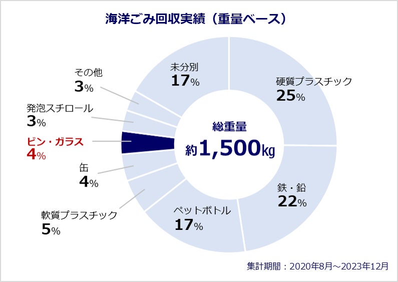 当団体では、香川県小豆島の多尾海岸で毎月ビーチクリーン活動を行っています。2020年8月からこの活動を開始し、3年以上経った今、回収した海洋ごみの総重量は1,500キロを超え、多尾海岸にも多種多様な海洋ごみが海上・海底・海岸に存在していることが明らかになりました。これまで当団体が回収した海洋ごみの内訳は、廃プラスチック類が非常に大きな割合を占めており、次いで金属、ビン・ガラスなどとなっています。今回、当団体と有限会社ランドベルが協働で再資源化を進めていくビン・ガラスは、廃プラスチック類と比較すると重量ではあまり多くはありませんが、ビン・ガラスが自然界で分解されるために必要な期間は100万年以上と言われており、決して見過ごすことのできない海洋ごみの一つです。また、ビン・ガラスは波にもまれて角の取れた小さな破片と細かくなり、近年では「シーグラス/ビーチグラス」と呼ばれ、アクセサリーなどで再利用されることもありますが、その再利用量はごくわずかであり、より効果的な再資源化が望まれています。