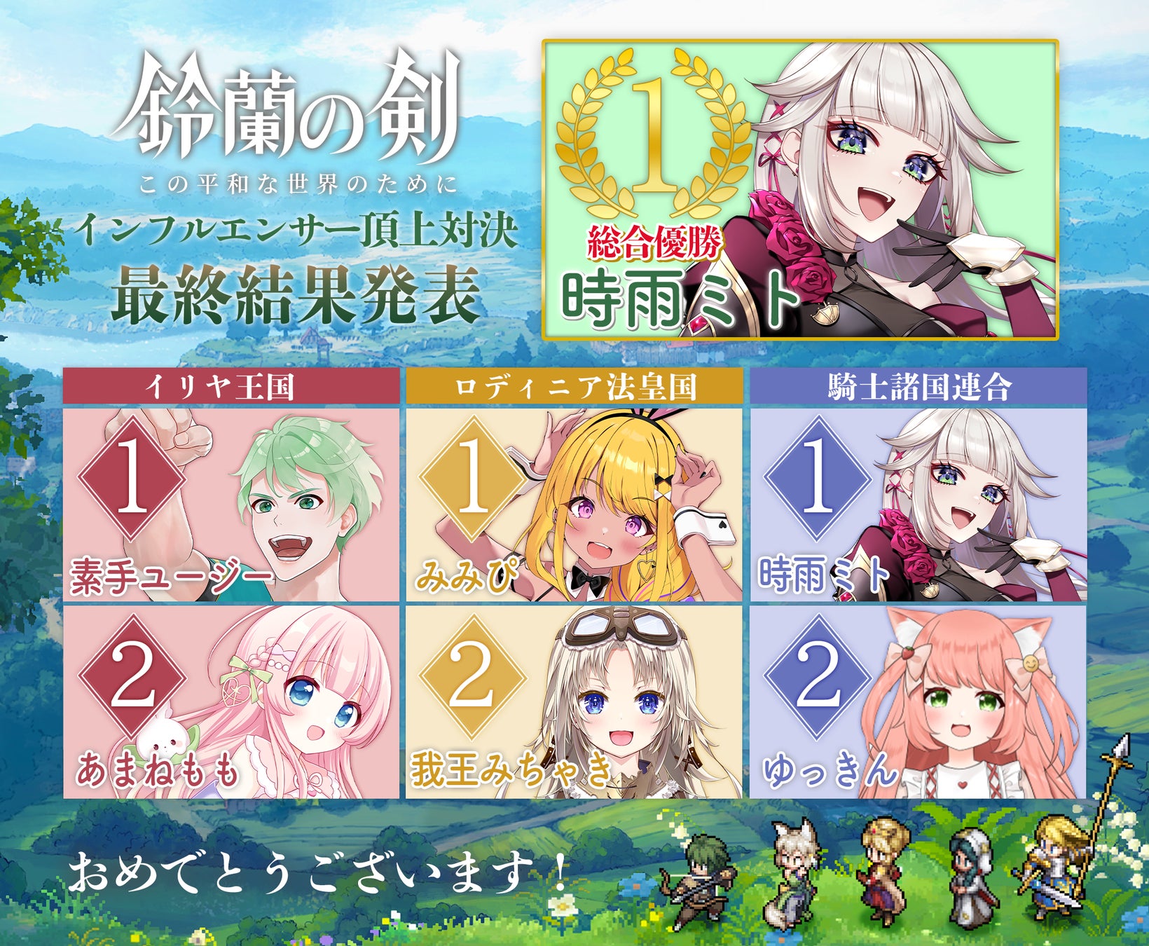 イベントではインフルエンサーの時雨ミトさんが騎士諸国連合陣営で参戦し見事総合優勝を果たし、イリア王国陣営からは素手ユージーさんが一位、ロディニア法皇国陣営のみみぴさんが一位となりました。さらに二位以降の結果は下記の通りです。総合部門の優勝者には賞金10万円とイベント優勝トロフィーが送られます!