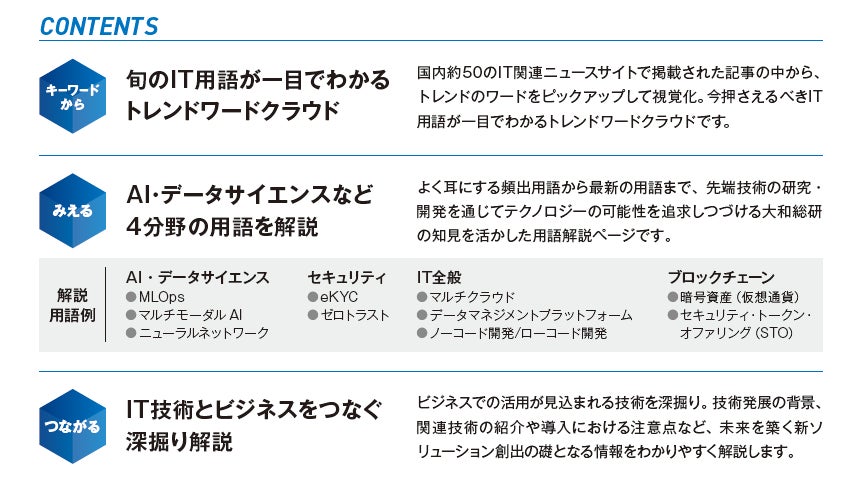 大和総研がこれまでに培ってきた豊富な経験をもとに、未来を築く新ソリューション創出の礎となる情報を、明快かつ深い解説でお伝えする用語解説サイト「WORLD」(ワード)と、IT技術とビジネスをつなぐソリューションをご紹介する「ITソリューションサービスサイト」を同時リリースします。