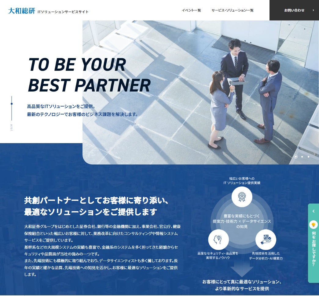 大和総研は、基幹系の大規模システムや金融系システムの開発・運用を多く担ってきた実績、高度なセキュリティおよび高品質なシステム運用のノウハウ、先端技術を活用したデータ分析力・AI構築力により、お客様に最適なソリューションをご提供しています。