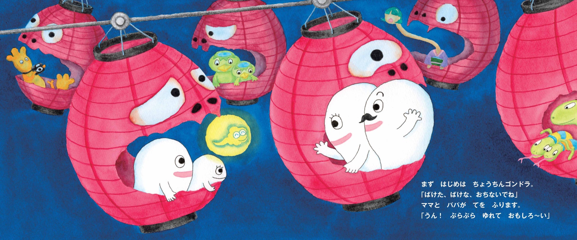 ちょうちんゴンドラで遊ぶばけたくんファミリー。他のおばけたちもいて、とっても楽しそう!
