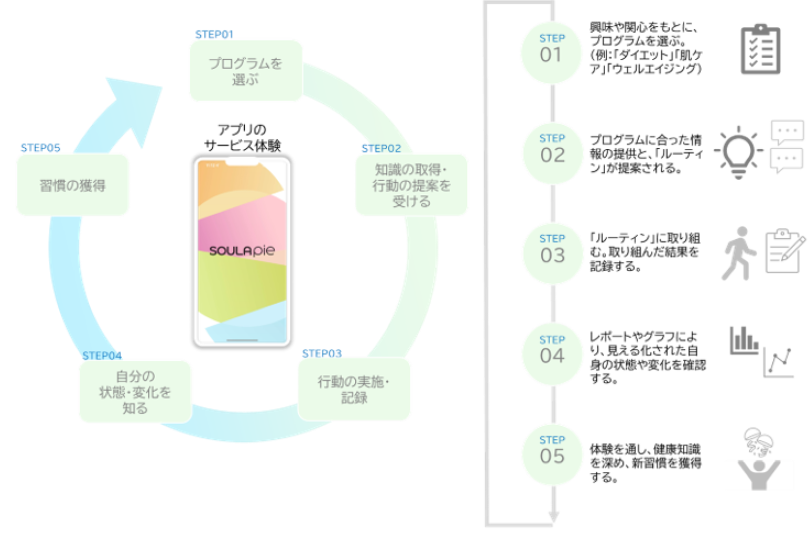 SOULA pieは、ダイエットやウェルエイジング、肌ケアといった多彩な標準プログラムを搭載しており、ユーザーが自身の興味・関心に合わせて選択ができるようになっています。
