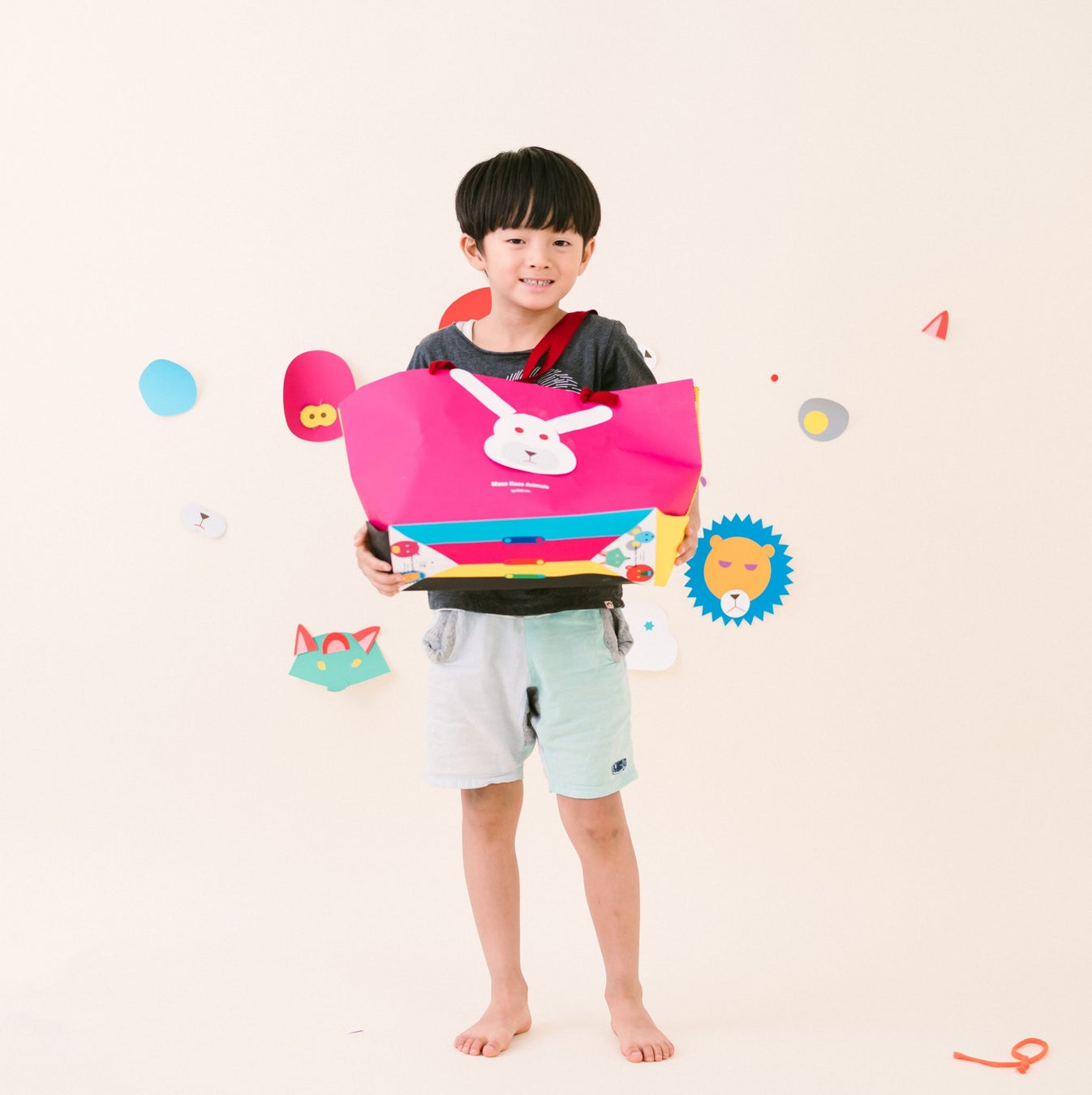 パッケージの制作過程で出てしまう紐の廃材と工場さんの印刷テスト用の紙を使い、子どもたちと紙のカバンを作るワークショップを2日間実施しました。(工場さんの印刷テストの際に、紙のカバン用のデータを印刷してもらうことで、通常は捨てられてしまうテスト用の紙をワークショップの素材として活用)