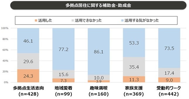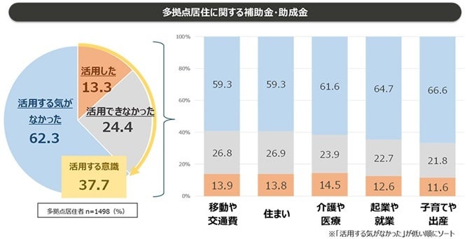 多拠点居住に関する自治体や企業からの補助金・助成金について、活用する意識(「活用した」+「活用できなかった」)は約4割。
