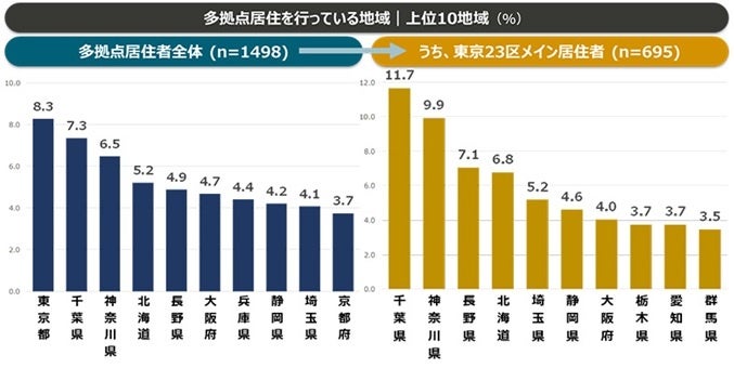 サブ拠点の地域ついて、主たる居住地を東京23区にもっている多拠点居住者に絞ってみると、「千葉県(11.7%)」「神奈川県(9.9%)」が高く、隣接する都道府県へ行き来する割合が高い傾向がみられる。