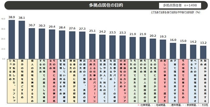 多拠点居住の目的は、「気分転換したり、リフレッシュするため (38.9%)」が最も高く、「自分の時間を過ごすため(38.1%)」、「個人の趣味を満喫するため(30.7%)」と続く。