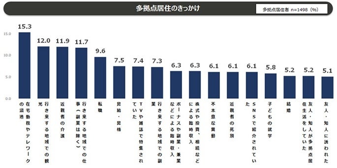 多拠点居住のきっかけは、「在宅勤務やテレワークの浸透(15.3%)」が最も高く、「行き来する地域での観光(12.0%)」、「近親者の介護(11.9%)」と続く。