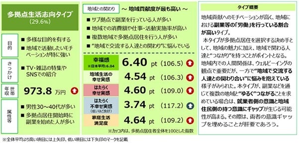 いずれのケースも、多拠点生活志向タイプで特に高く、副業については全体と比べて13.5ptの差がある。