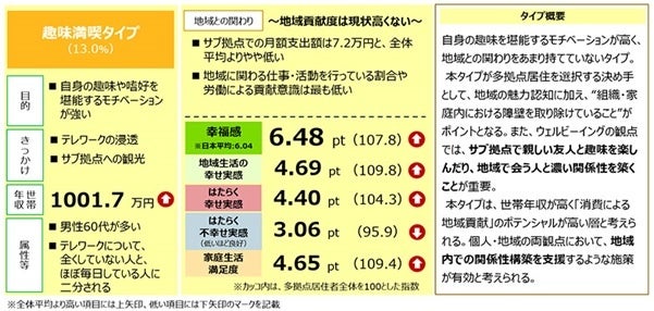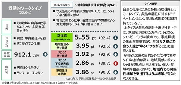 また、5つの生活タイプのうち、能動的に多拠点居住を選択している『多拠点生活志向』、『地域愛着』、『趣味満喫』タイプの主観的幸福感は、日本の平均値*よりも高い傾向。*World Happiness Report 2022:Japan【6.039】