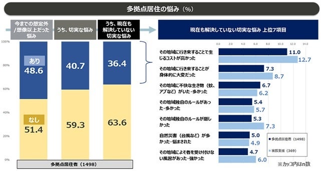 多拠点居住者の中で、現在も解決していない切実な悩みがある割合は36.4%。詳細をみると、「その地域に行き来することで生じるコストが高かった」「その地域に行き来することが身体的に大変だった」が高く、家族支援タイプでその傾向が強い。