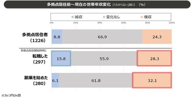 多拠点居住前から世帯年収が増えた割合は24.3%、減った割合は8.8%。