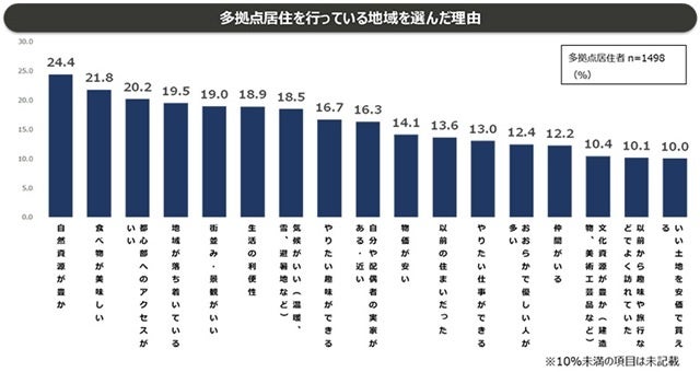 多拠点居住を行っている地域を選んだ理由について、「自然資源が豊か(24.4%)」「食べ物が美味しい(21.8%)」「都心部へのアクセスがいい(20.2%)」といった、“地域の魅力”に関する項目が理由として多くあがっている。