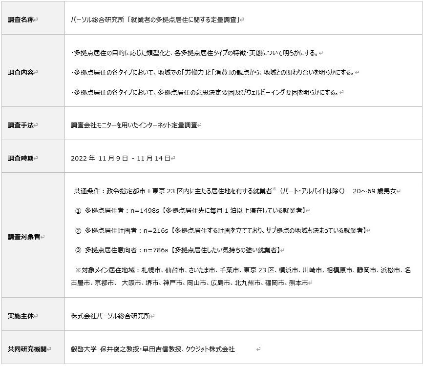 株式会社パーソル総合研究所(本社:東京都港区、代表取締役社長:萱野博行)は、「就業者の多拠点居住に関する定量調査」の結果を発表いたします。コロナ禍によるテレワーク普及などを背景に地方圏への移住や多拠点居住への関心が高まる中、本調査は、都市圏と地方を定期的に行き来する多拠点居住者に焦点をあて、その生活実態の把握および地域にもたらす効果(労働・消費)などを解き明かすことを目的に実施しました。