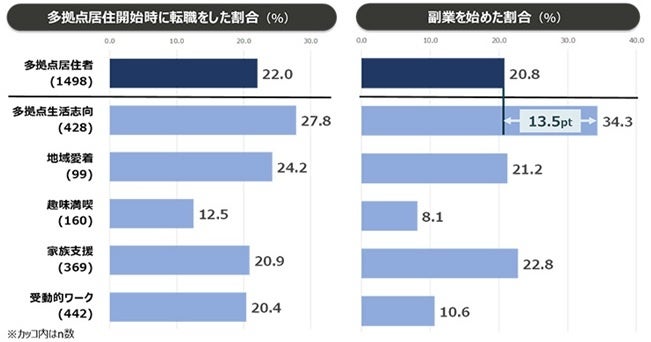 特に多拠点生活志向タイプでは、多拠点居住開始時に転職した割合が27.8%。また、3人に1人が副業を始めており、いずれも全体平均と比べて高い傾向。