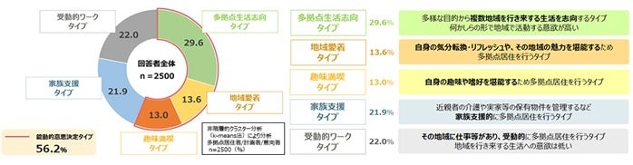 調査の結果、多拠点居住者、計画者、意向者2,500サンプルを多拠点居住の目的に基づいて、以下の5タイプに分類しています。また、5タイプの内、「多拠点生活志向」、「地域愛着」、「趣味満喫」は、能動的に多拠点居住を選択しているタイプと考えられます。