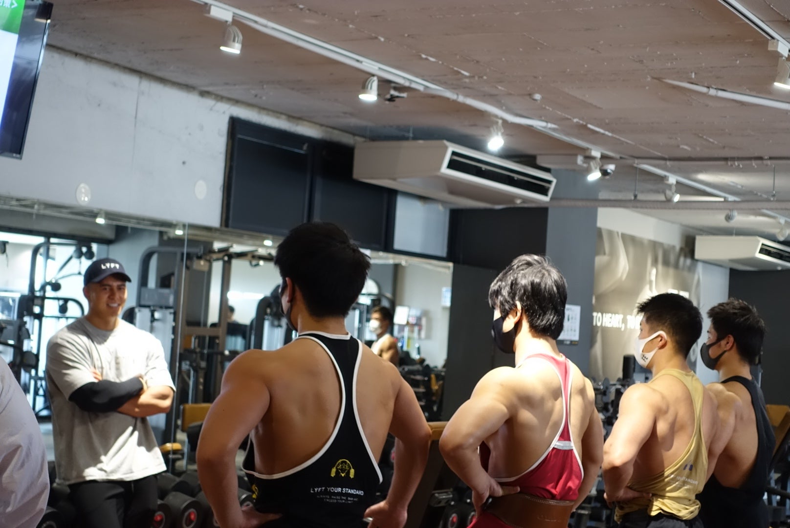 鍛える部位ごとに、姿勢の角度、効率的なマシンの使用方法、目線など細かくレクチャーし実演も交えながらわかりやすく指導しました。更にはポージング指導も行われ、個々へフィードバックとエールを送りマッチョ介護士にとっては多くを修習する場となりました。トレーニング方法にとどまらずフィットネス選手としての在り方やマインドの持ち方を話し一人一人と向き合う熱の入った指導が行われました。