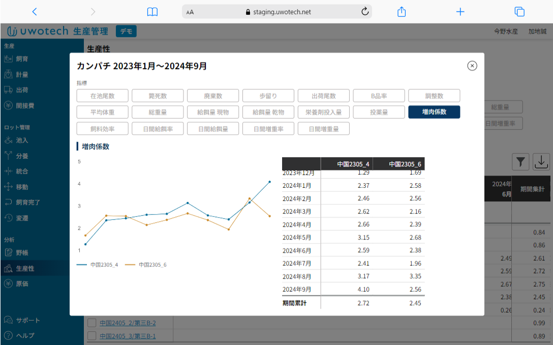 「uwotech生産管理」は、魚類養殖の生産者の生産性向上と採算性改善を目的とした生産管理システムです。デジタルに不慣れなユーザでも、複雑になりがちな漁場構成を直感的に管理し、日々の給餌・へい死・投薬・出荷などのデータを手軽に記録できます。増肉係数や日間給餌率などの生産指標を種苗別や魚群別で様々な角度から集計・比較・分析することができ、グラフ化まで自動で行えるようになっています。また総平均法や移動平均法での原価計算や間接費の配賦など、経営管理に欠かせない原価機能も搭載しており、データを基に生産計画や販売計画、資金繰り等を臨機応変に見直すこともできます。月々5,000円~で利用でき、無料でお試し頂くことも可能ですので、ぜひお気軽にお問合せください。