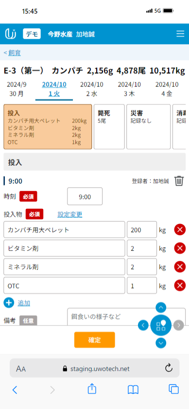「uwotech生産管理」は、魚類養殖の生産者の生産性向上と採算性改善を目的とした生産管理システムです。デジタルに不慣れなユーザでも、複雑になりがちな漁場構成を直感的に管理し、日々の給餌・へい死・投薬・出荷などのデータを手軽に記録できます。また、蓄積されたデータを元に生産指標の分析・グラフ化や原価計算も簡単に行えるようになっています。