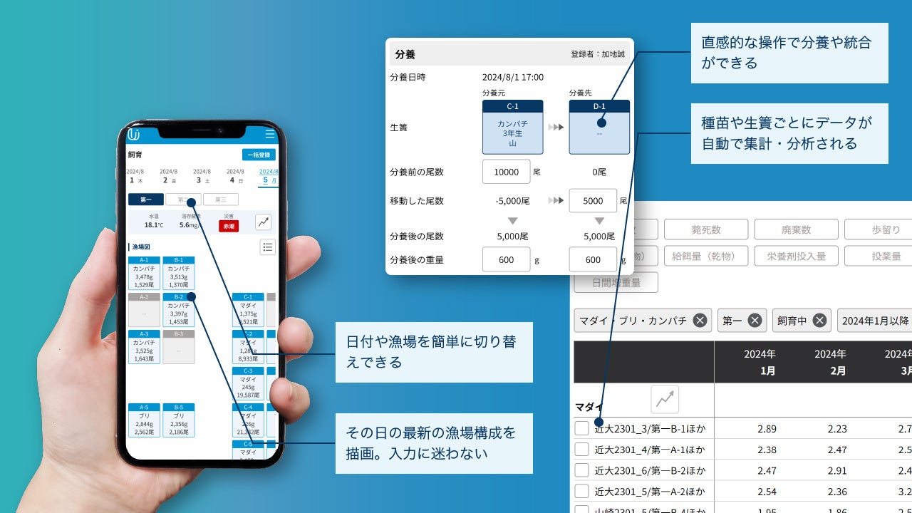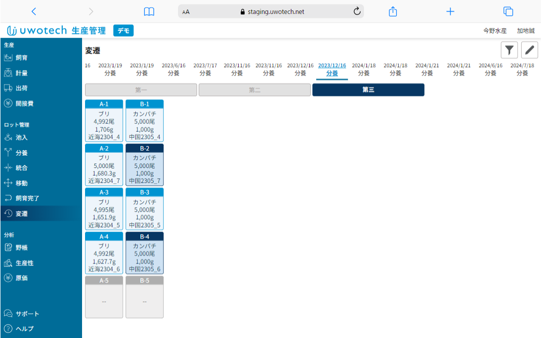 従来の紙やExcel中心の管理・運用では、分養※や統合を行った際に飼育日誌が複雑になりすぎてしまい、全体を俯瞰した横断的な管理がしづらくなっていました。そこで、漁場構成を軸に飼育データを蓄積する「漁場図」の仕組みを開発し、誰が見ても直感的でわかりやすくデータを管理できるようにしました。さらに様々な現場の実務にフィットするよう生産者のフィードバックを元に改善を重ね、直感性・汎用性・柔軟性を兼ね備えたロット(種苗・魚群)管理を実現しました。