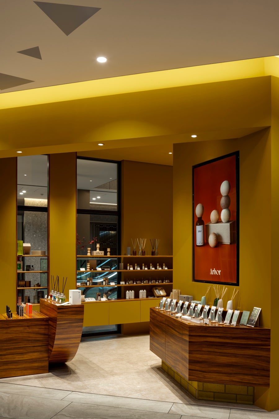 リニューアルにあたり、空間デザインも刷新しました。基調としたのは、名古屋・尾張地方の粘土質の土を思わせる温かな黄色土です。過度な装飾を削ぎ落とし、香りと静かに向き合える余白のある空間に仕上げています。売り場は緩やかな曲線で構成し、視線や動線に柔らかさを持たせる設計であり、「気取らずに立ち寄れること」「どなたでも自然に試せること」を前提に、心理的なハードルを下げることを意識しました。香りを選ぶ時間そのものが体験価値になるよう、空間全体を通して設計しています。