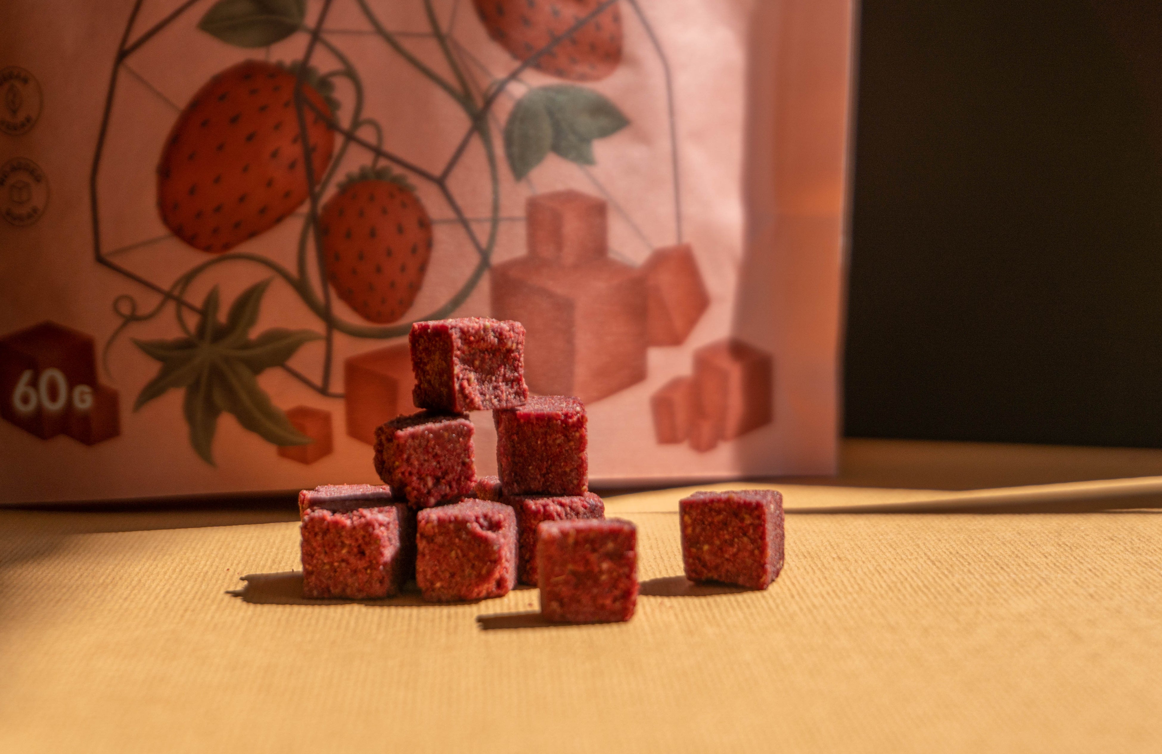 1パックに400〜500gの新鮮なフルーツをフリーズドライによって60gまで凝縮し、フルーツの濃い味わいと豊富なビタミン類、ココアバターに含まれる飽和脂肪酸で甘みと口の中でとろける様な味わい、スーパフードのヘンプをCBDアイソレートで配合することでCBDの摂取と他の素材の味を強調し、貴重な水溶性食物繊維イヌリンを配合し腸内環境へアプローチ、食材本来の味わいとキャリアオイルを使用しないで体内へアプローチを行い、人工甘味料を使用せず、自然由来の食材で生み出された,”健康的なお菓子"を追求した新感覚CBD製品。