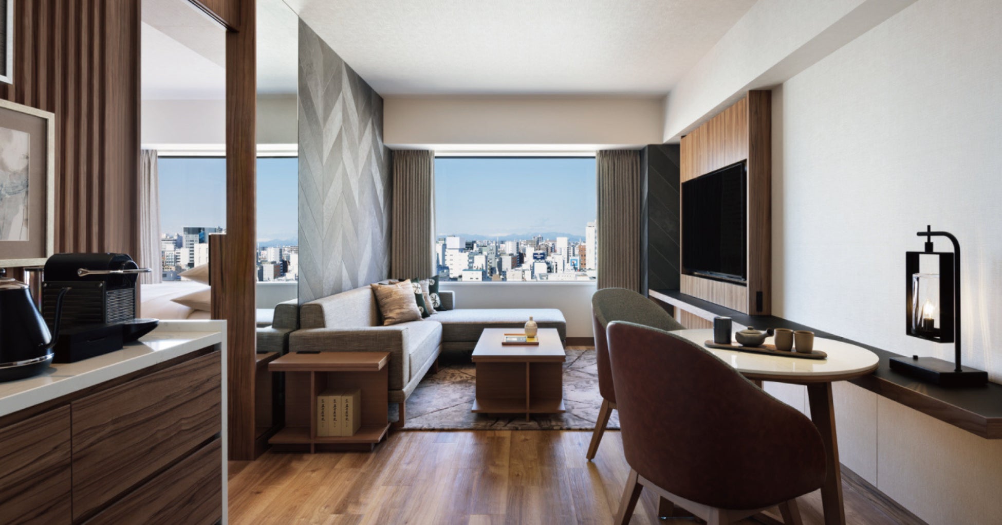 360室の客室のうち、56㎡のゆったりとした造りの全10室のコートヤードスイートは、木のぬくもりをイメージさせる暖かみのあるデザインで、外光を取り込み明るく開放感ある空間となっています。各客室には、名古屋ならではのアイテムを取り入れ、名古屋の伝統工芸である有松絞りのクッションをご用意しています。また、コーナーに位置するスイートルームからは、名古屋駅周辺のビル群の絶景がお楽しみいただけます。