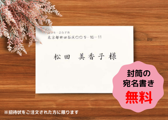 結婚式招待状印刷をご注文された方に限り、無料で封筒(白)の宛名筆耕(宛名書き)をお受けしています。
