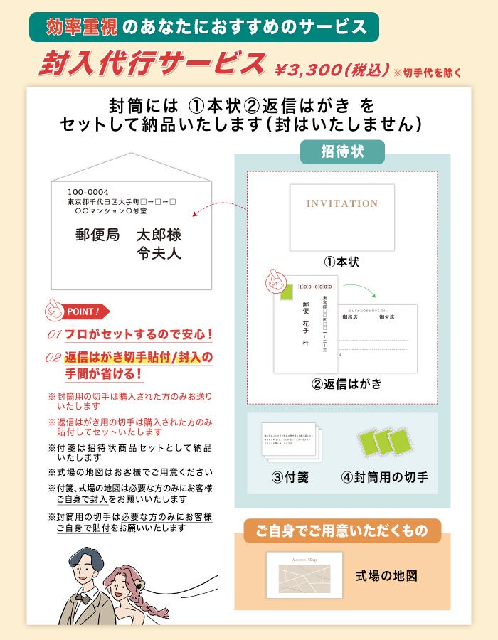 封入代行サービス(有料)を利用すれば返信用はがきに慶事用切手を貼った状態で本状と共に封筒にセットして納品いたします。(封はいたしません)