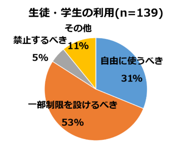 一方で生徒や学生による生成AIの学習への利用は、半数以上が「一部制限を設けるべき」と回答しています。そのため学習の現場においてAIをルールもなく利用できる期間は残り短いのではないかと考えられています。