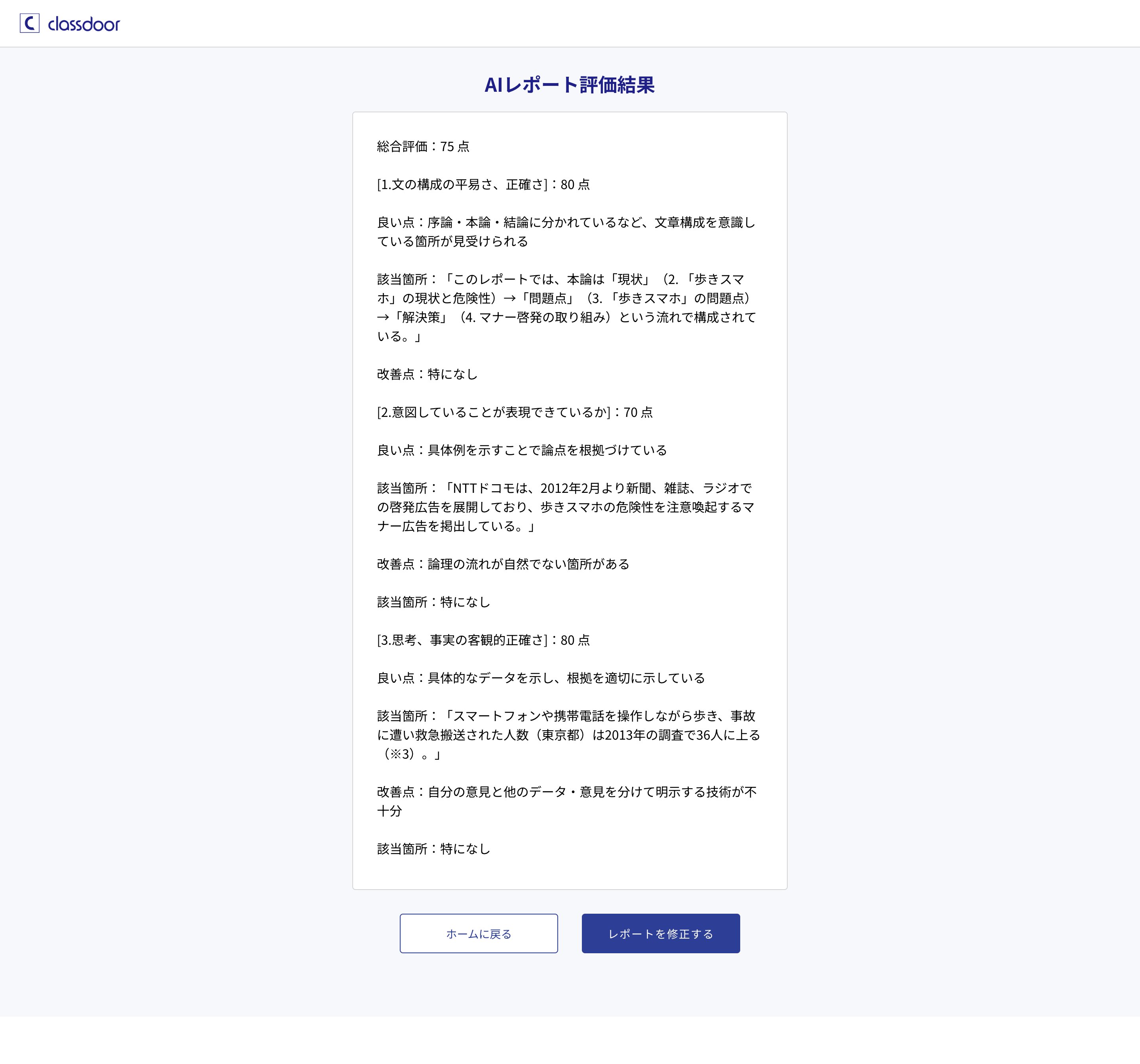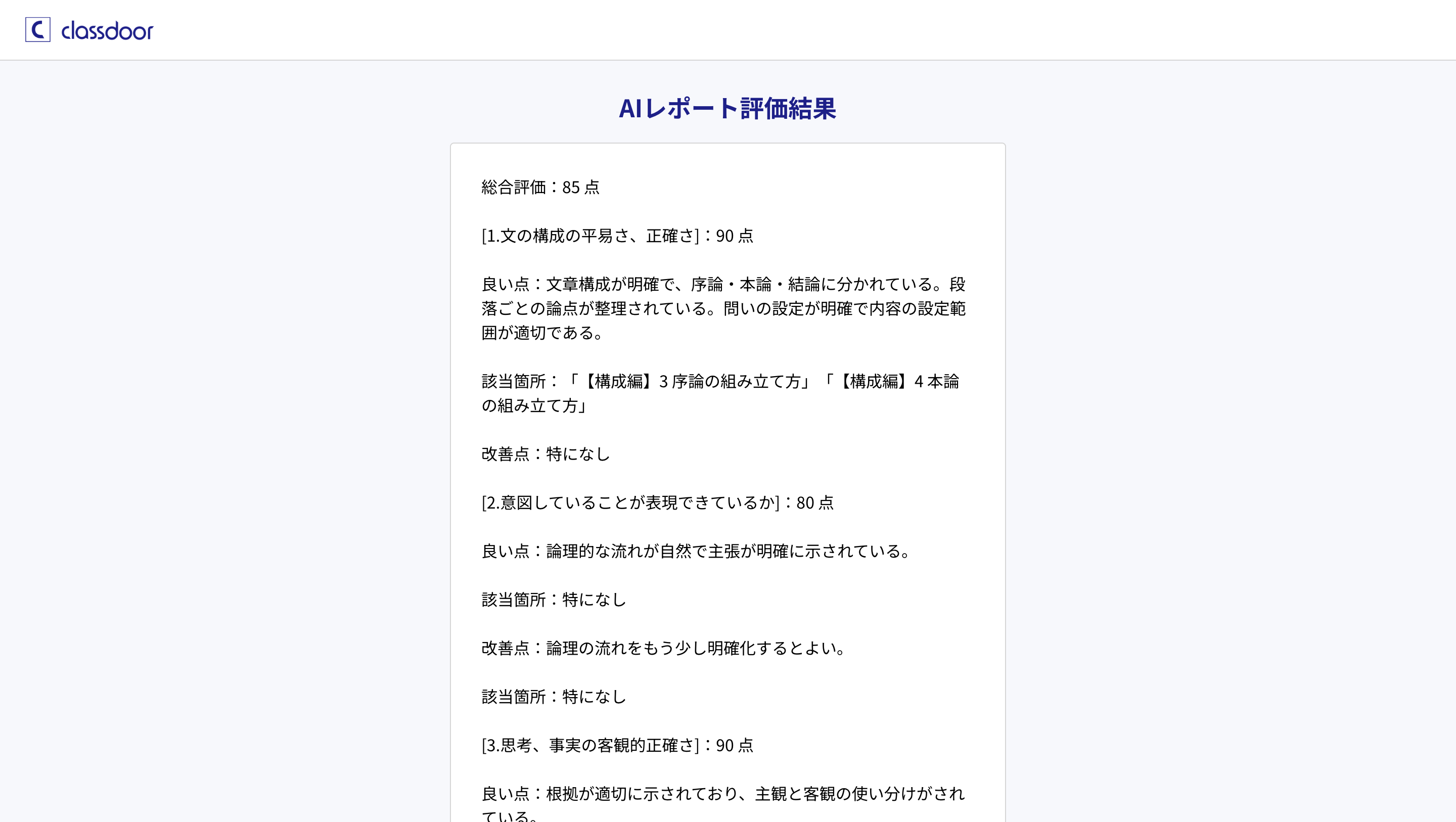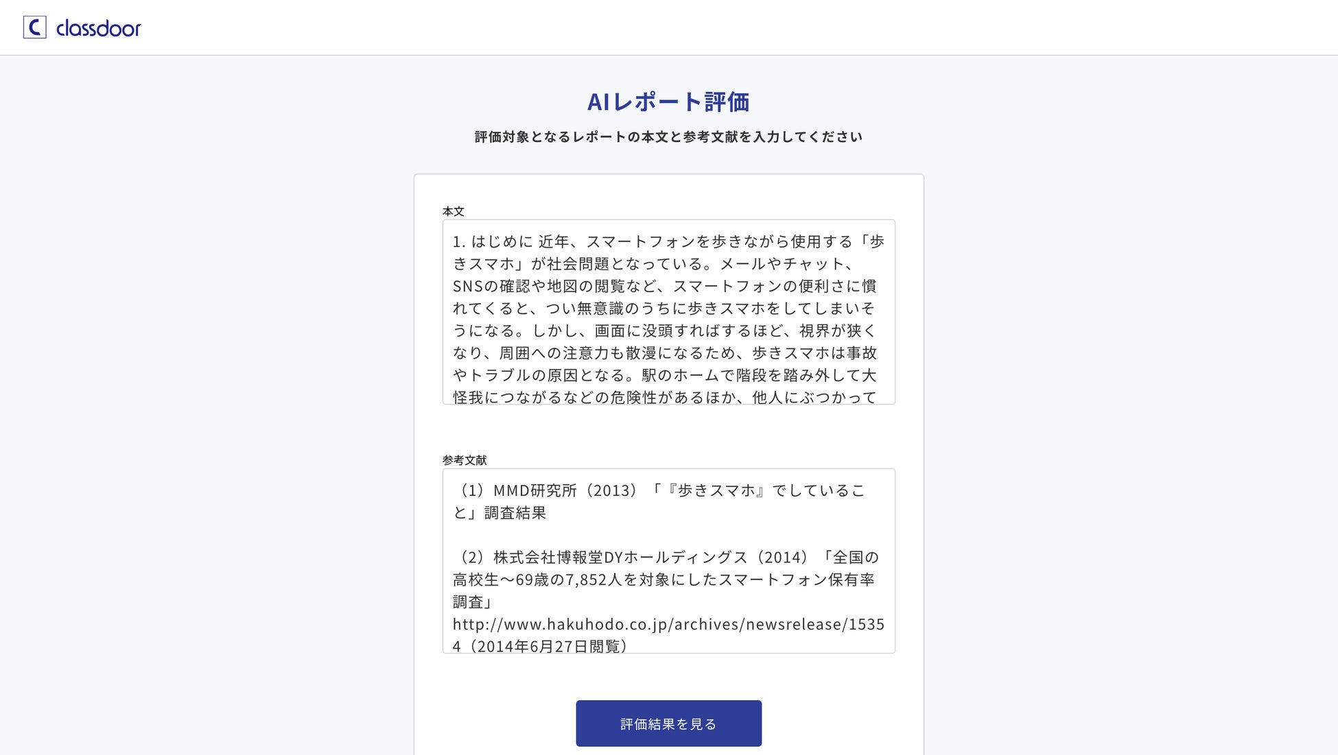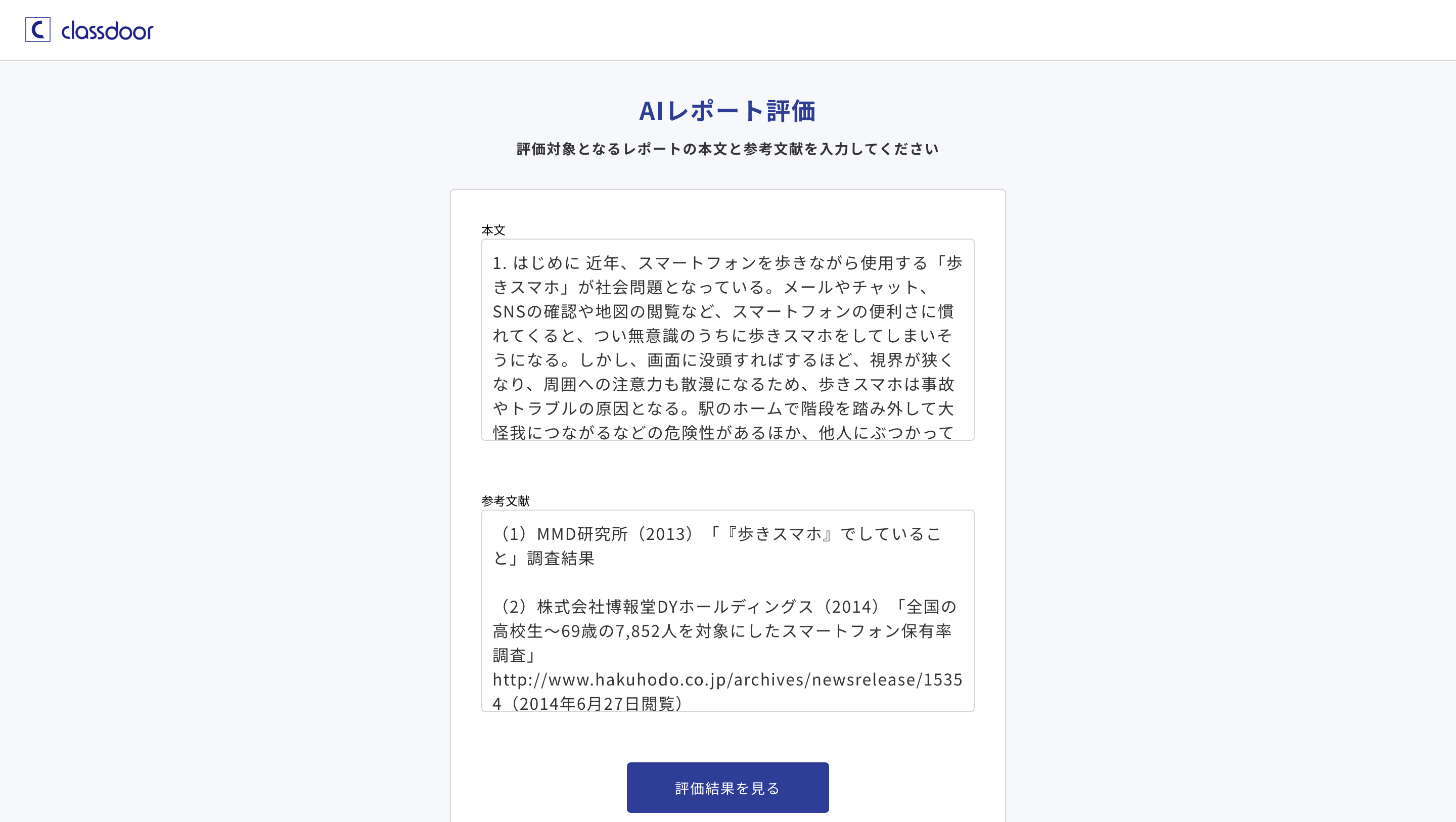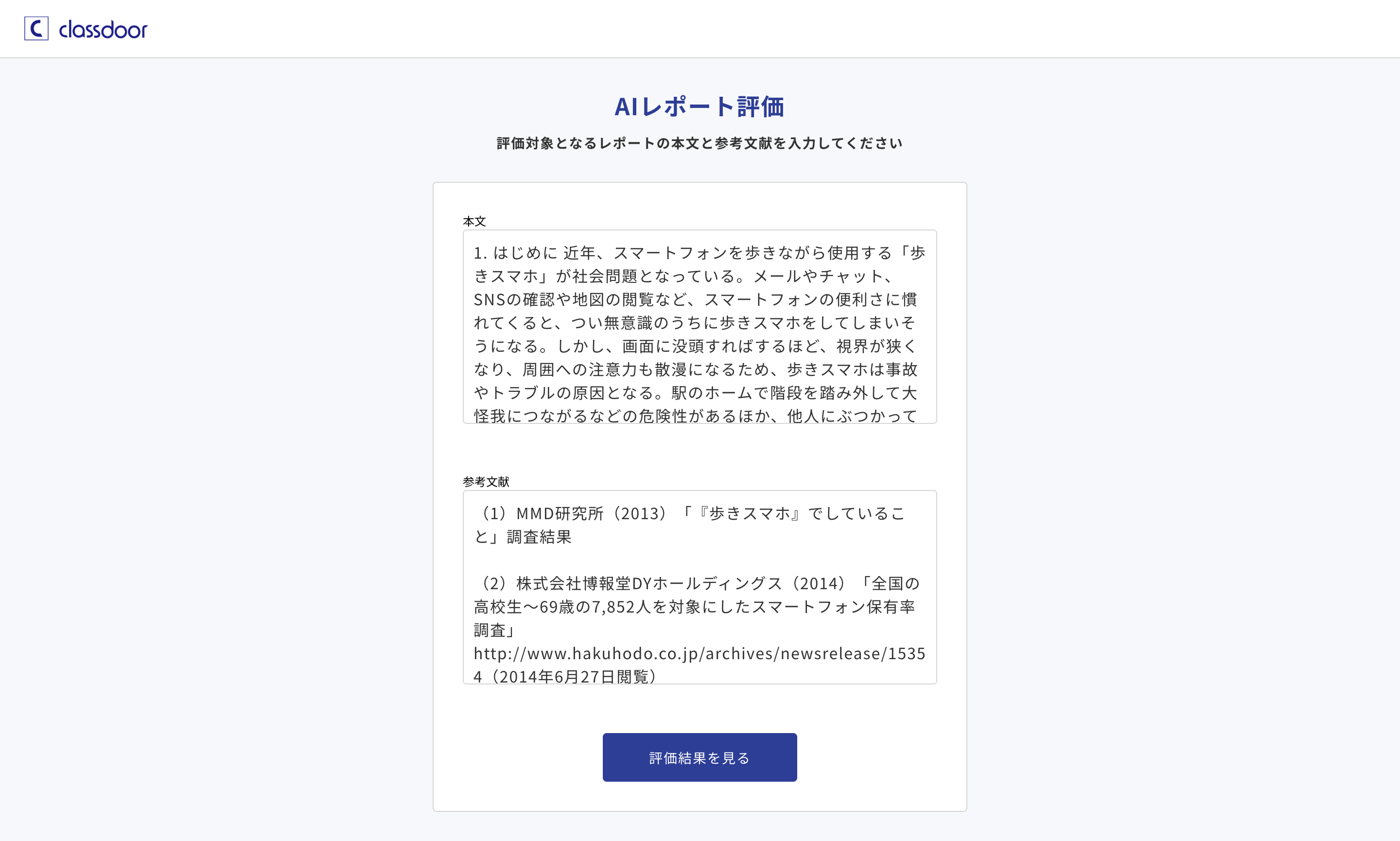 「classdoor」で作成したレポート、またコピペした文章からもAIレポート評価機能α版は利用できます。