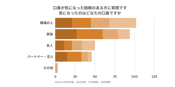 最も「口臭を気づかれたくない人」で「職場の人」という結果が出ましたが、逆に「誰の口臭が気になったか」との質問に対しても「職場の人」と回答した人が400人中102人いました。