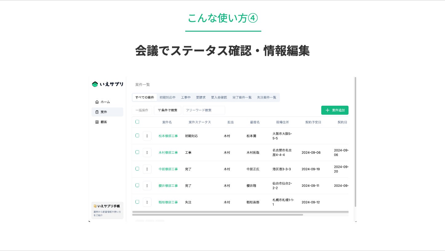 「初期対応中」「工事中」「要請求」「要入金確認」など、条件にあった案件をワンクリックで表示することができます。会議しながら情報を更新したいときなどは、一覧画面の中でエクセルのように情報を編集できます。