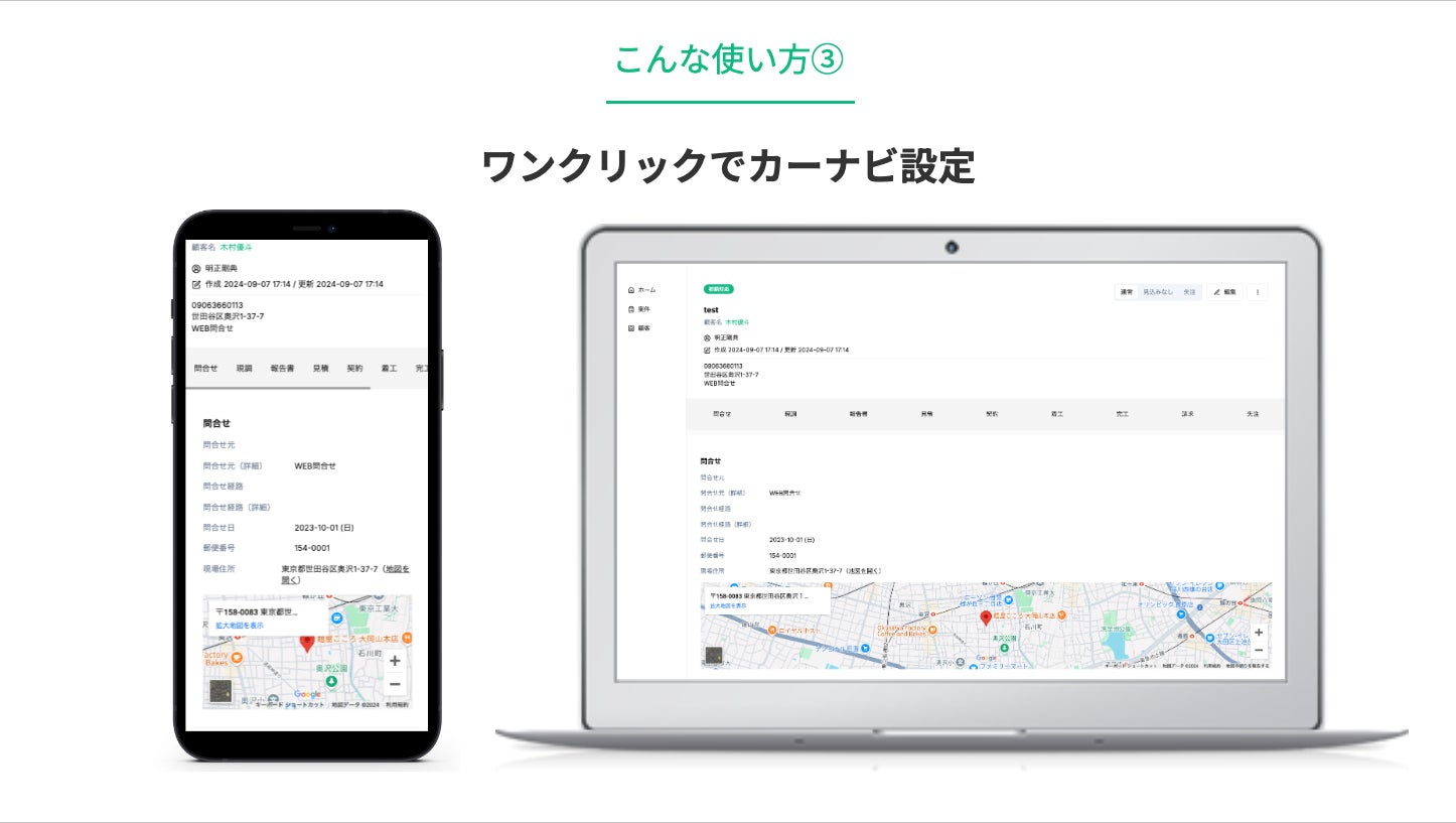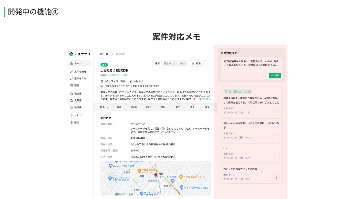 いえサプリ上に、住所をもとにGoogle Mapが自動表示されます。現場の場所が大体わかるだけでなく、現調などで現場に赴く時に、手軽にGoogle Mapの経路を開くことができます。