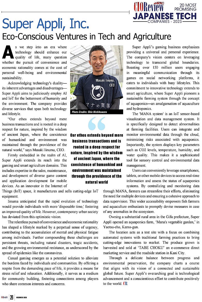 ゲームコンテンツの制作とアクアポニックス向けIoTの開発を行う株式会社スーパーアプリは、アメリカの技術誌「CIOReview APAC」において、「日本のテクノロジー企業トップ20」に選ばれましたことをお知らせいたします。
