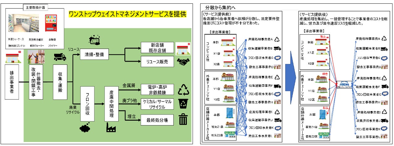 エリア毎に産業廃棄物を集約する為に作られた、当社による全国の収集運搬・処理事業者ネットワークは、広域展開しているコンビニ業界、店舗什器業界、飲料業界等多種多様な産業の横断型プラットフォームであり、持続可能社会の基礎的インフラとなりつつある。